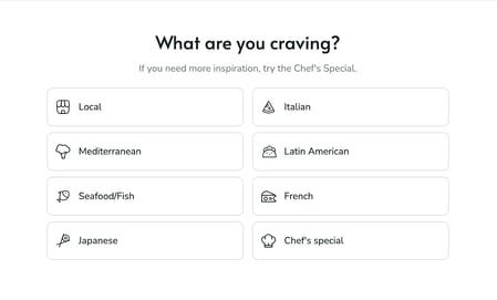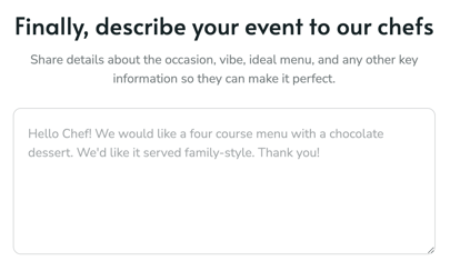 Looking for something specific that’s not listed? You can click on “Chef’s Special” in the What are you craving? section and later on share your desired menu, cuisine, or technique in the comment box on the request form, and we’ll connect you with the ideal chef.