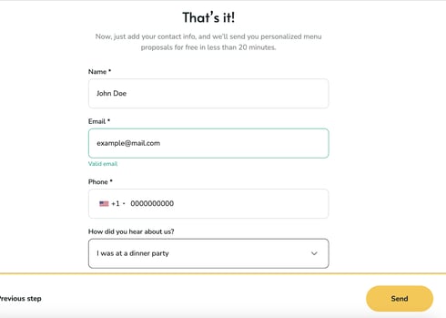 Note: During the process, you'll be required to provide essential information such as your name, email, and phone number. Rest assured, this information is secure and will not be shared with the chefs. - Enter your information to create your profile and receive proposals in the future.