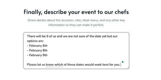 Also, indicate in the "notes for the chef" section that this date is flexible and provide a range of dates when you're available so our chef can determine which date would suit them best and know that the originally selected date may vary.