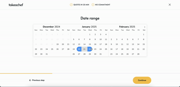 Planning a service but unsure about the exact dates? Don't worry! At Take a Chef we understand that scheduling can require a lot of planning and organizing with your group. That's why we offer a flexible solution that allows you to start planning your service without having to commit to specific dates from the start.