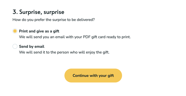 - Proceed to checkout and complete your payment. Your Gift Card will be sent according to your chosen delivery option, making it the perfect gift!