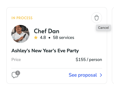 - Cancel the proposal: If you prefer to explore other options, you can always cancel the proposal. This is a straightforward process that can be completed by clicking on the trash icon located in the upper right corner of the proposal. By canceling, you'll be able to receive new proposals from other chefs that better suit your budget and requirements.